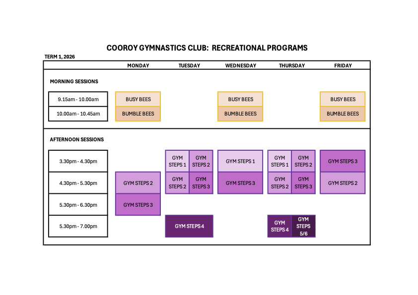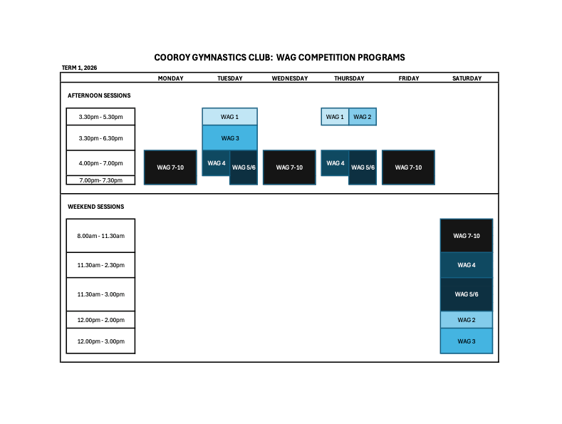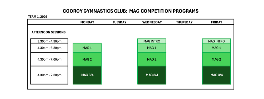 Class TimetableOur 2026 timetable for Recreational, MAG Competition and WAG Competition Programs are set out below. Recreational Program MAG Competition Program WAG Competition Program ENROL OR BOOK TRIAL TODAY!
